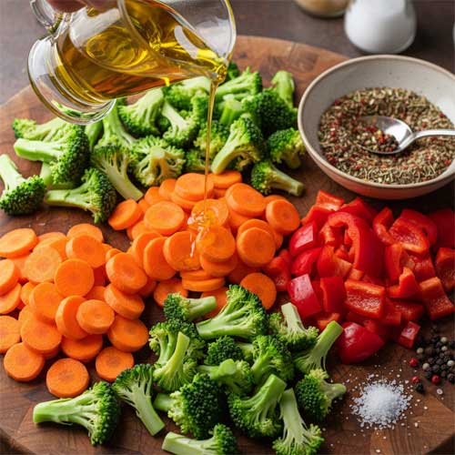 - Овощи нарежьте крупными кусками, полейте оливковым маслом и посыпьте специями.